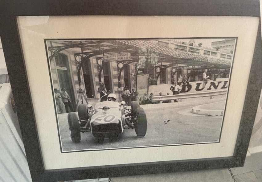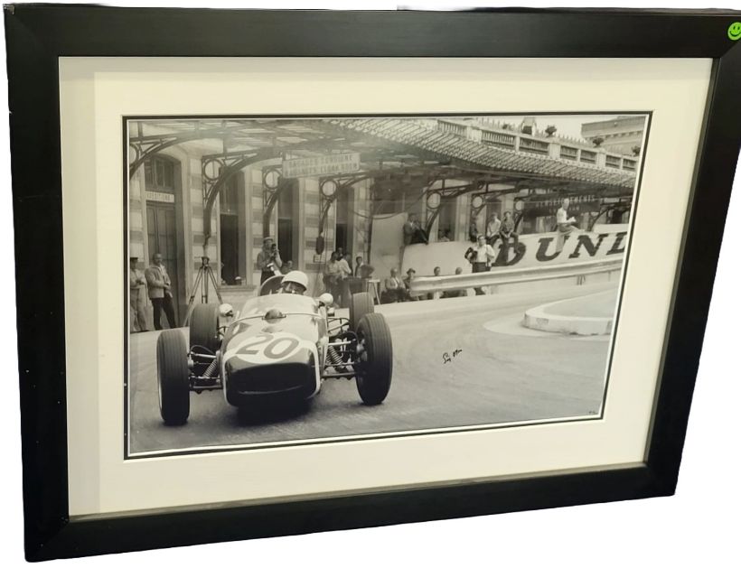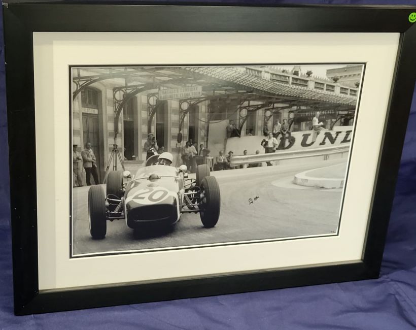 Behind the wheel of the previous year's Lotus 18, Moss was not expected to be up with the front runners but proved everyone wrong, finishing ahead of all the Works teams. Number seven of only 60 prints, framed behind glass with a Certificate of Authenticity.