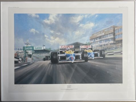 Commissioned to celebrate Nigel Mansell CBE's 1986 victory at the Brands Hatch British Grand Prix depicting the Brummie hero keeping Nelson Piquet behind him along the start finish straight at the Kent track in their respective Williams-Honda FW11s, signed by Nigel the renowned British Motor Racing artist and numbered 263/280, framed, glazed and measuring 70cm x 53cm .